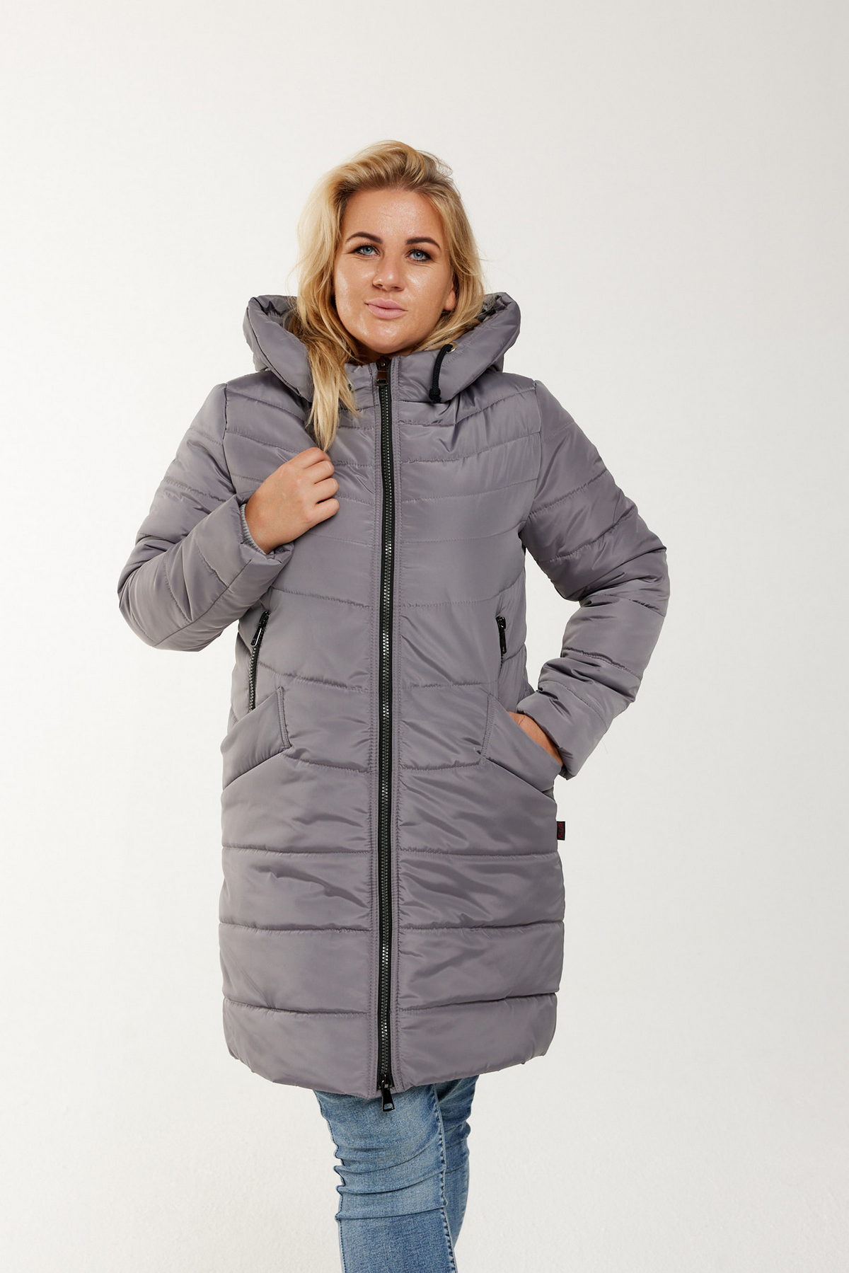 Zimowa, ocieplana kurtka damska Ala wykonana z wodoodpornego materiału zara z kapturem i kieszeniami.